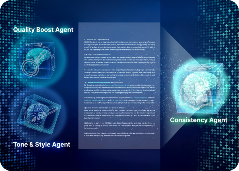 翻訳やサマリー作成、用語集を管理するエージェントだけでなく、「文章の品質向上」「表現の調整」「翻訳の一貫性・整合性の管理」の各役割に特化したAIエージェントが、高品質な翻訳を実現します。